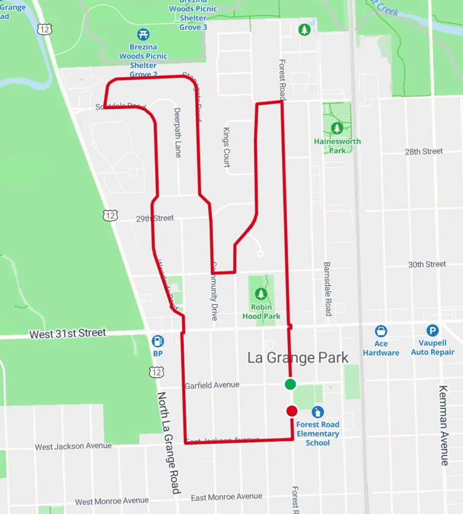 ❋ Start/Finish lineForest Road School, 901 Forest Road, La Grange Park.