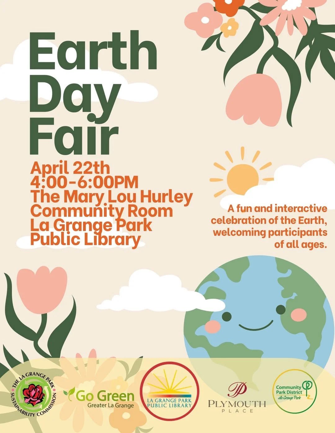 Back to All Events Earth Day Fair Monday, April 27, 2026 4:00 PM 6:00 PM La Grange Park Library 555 North La Grange Road La Grange Park, IL, 60526 United States (map) Google Calendar ICS Earth Day Fair at the La Grange Park Library A free community-focused event celebrating sustainability, environmental stewardship, and education open to people of all ages. Includes engaging, hands-on opportunities to learn about caring for our environment.